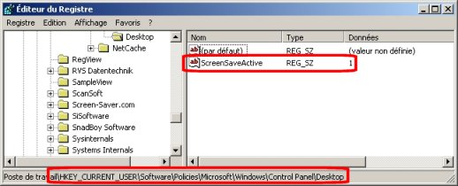 On peut voir que la clef correspondante est Software\Policies\Microsoft\Windows\Control Panel\Desktop\ScreenSaveActive, ce qui est confirmé par l'ouverture automatique de REGEDIT :